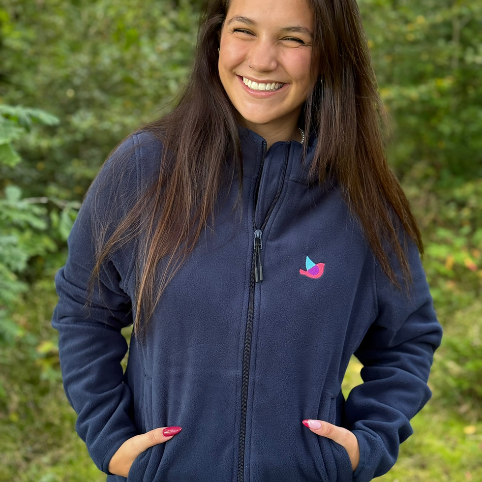 Dunkelblaue Fleecejacke mit Stickerei vorne